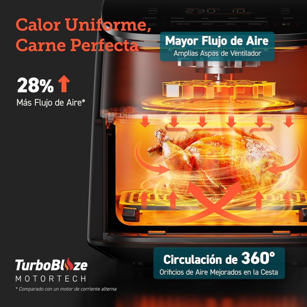Aquí es donde la Turbo Blaze marca diferencias claras frente a muchas freidoras de aire tradicionales. Gracias a su motor DC y a la tecnología TurboBlaze, la circulación de aire caliente es más potente y uniforme, lo que se traduce en tiempos de cocción mucho más cortos. En la práctica, platos que antes requerían más de 20 minutos ahora están listos en torno a 12–15 minutos, sin perder textura ni sabor.